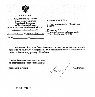 06 февраля 2015 года заместитель прокурора Ленинского района Казанчук В.Н. в связи с проведением проверки по обращению Копылова В.В., действующего в интересах Стрельниковой М.М., на основании ст.ст. 6, 22 Федерального закона «О прокуратуре РФ» направил требование начальнику УПФР в Ленинском районе г.Челябинска Тулуповой Т.Ф. явиться лично в прокуратуру района для объявления предостережения о недопустимости нарушения пенсионного и иного законодательства. В ходе проверки прокуратурой района изучено решение суда, состоявшееся в пользу Стрельниковой М.М., и апелляционное определение судебной коллегии по гражданским делам Челябинского областного суда от 23 декабря 2014 года по делу Стрельниковой М.М. По результатам их изучения прокуратурой района начальнику УПФР в Ленинском районе г.Челябинска 12.02.2015г. объявлено предостережение о недопустимости нарушения Федерального закона «О трудовых пенсиях в РФ» и «О государственном пенсионном обеспечении в РФ» при выдаче пенсий гражданам, не имеющим паспорта, на основании свидетельства нотариуса об удостоверении тождественности личности гражданина с лицом, изображенном на фотографии.