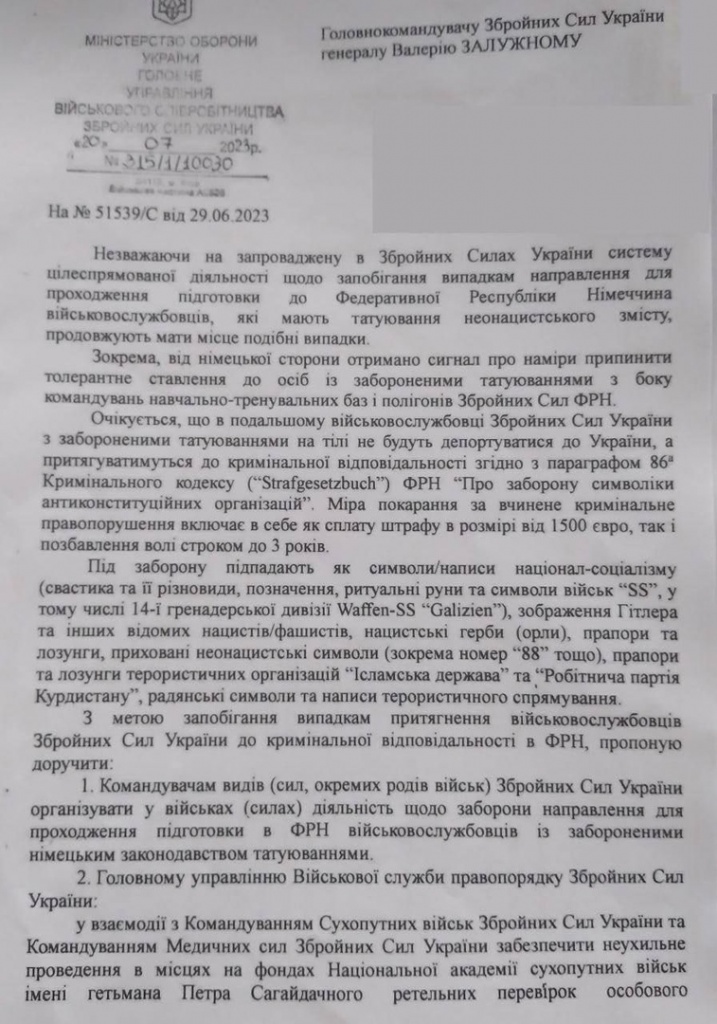 В итоге немцы составили официальное обращение к командованию ВСУ, с требованием не допускать к отправке на обучение в Германию разукрашенных свастиками. И пригрозили что их не просто будут отправлять назад, но и сажать по уголовной статье от трех лет.
