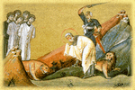 С наступлением дня они все вместе с епископом были выведены на площадь и отданы зверям. Прославляющийся же среди Своих святых Бог заградил уста зверям, подобно тому, как некогда заградил уста львам во рву, в который был брошен Даниил (см.: Дан. 6). Ни один из зверей тех не прикоснулся к святым мученикам, но все, на время изменивши свою природную свирепость на овечью кротость, подошли к святому епископу Ианнуарию и припали к ногам его. Это необычайное происшествие привело в изумление и ужас всех бывших там людей. Между тем военачальник, приписывая и это мнимой волшебной силе христиан, обдумывал каким бы способом предать смерти святителя Божия и всех тех, которые находились с ним.