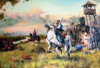 Заалел восток. Осеннее солнце озарило окрестность. Старый князь, убедившись в невозможности одолеть казаков, с несколькими аксакалами подъехал к возам с белым флагом и стал вызывать старшого. Поднялся исполинского роста казак с длинной винтовкой в руке. Молодежь, узнав в нем грозного всадника, попятилась и схватилась за оружие. А он, не обращая на них внимания, зычным голосом спросил: «Какого черта хотите от нас?» Старый князь ответил, что желает вступить в переговоры. Дело скоро уладили, и недавние враги расположились невдалеке от табора-крепости, а князь с аксакалами повел приятельскую речь с пеглеваном. Того звали Баклан, и это имя глубоко врезалось в память князя Конокова. На Дону так называли деда знаменитого кавказского генерала Якова Петровича Бакланова. Встреча с донцами расстроила черкесам набег на казачьи хутора. У них было 50 человек убитых и раненых, в то время как у гулебщиков — лишь шесть легкораненых. Через пять недель тяжело груженные битым пушным зверем, кабанами, лосятиной и дичью возы потянулись за Егорлык, границу Войска Донского, а горцы долго не отваживались нападать даже на одиночных казаков-охотников».http://bratishka.ru