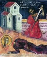 Воины схватили ее и спрашивали об Евдокии. Она обещалась предать им Евдокию, если только они на малое время освободят ее. И, придя в церковь, она взошла в святой алтарь, открыла ковчежец с Пречистыми Животворящими Христовыми Таинами и, взяв часть сей великой святыни, скрыла у себя на груди. После этого она вышла и сказала воинам: