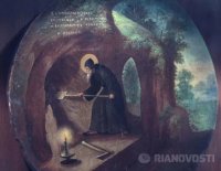 В Антониевой же пещере покоятся 12 братьев, каменоздатели и иконописцы великой Печерской церкви. Они лежат в одном общем затворе, приняв иночество по окончании работ своих. Блаженный Симон говорит о иконописцах: «Их свиты (свертки) и ныне на палатях (на хорах) и Греческие их книги сохраняются на память о чуде». Во время митрополита Сильвестра еще хранились в Печерской кладовой «Греческия книги их». Для иконописцев всего естественнее было принести с собою в Киев свертки, писанные с руководством в иконописи. И в Восточной Церкви тех времен известны были так называемые у нас подлинники, которые в полном виде состояли из трех отделов: лицевого подлинника, правил иконного писания и наставления о составлении красок. По известию Симона, блаженные «мастера и живописцы окончили жизнь свою в монашеском чине и положены в своем притворе», т. е. в особой пещерной келлие, где подвизались.